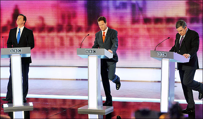 A further aspect (and I stray dangerously close to content here) was Brown’s constant references to tax credits and inheritance tax. In BBC’s Question Time afterwards Janet Street Porter said she thought she couldn’t take Brown saying ‘tax credits’ ever again. She also said the whole debate was a middle-aged white male event of no appeal to the majority of voters: women.