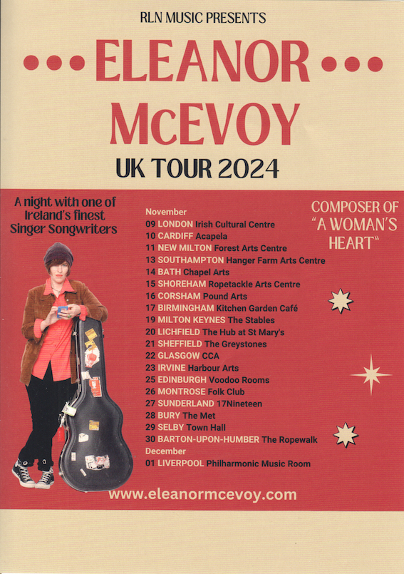 Review of Eleanor McEvoy at The Forest Arts Centre in New Milton, Hampshire. What can I say, except it’s the best musical evening of any kind in the last year. It’s solo: acoustic guitar, electric guitar, piano, violin and percussion. She’s a great singer, songwriter and what was new, seeing her for the first time, a marvellous narrator too. See the tour. Seventeen dates to go. Really try and get to one.