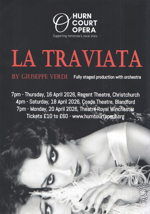 Follow link to the Hurn Court Opera production of LA TRAVIATA at Christchurch Regent. This was a marvellous production with emerging young professional singers. It goes on to Blandford and Winchester. A rare chance to see first class opera at a reasonable price too.