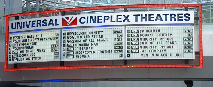 But if you’re going to a movie theater it’s far more likely to be the –re spelling which is used by the American chains, like Loews Theatres, Century Theatres, AMC Theatres, IMAX Theatres and Universal Cineplex Theatres. This results in bizarre conversations in American textbooks, following the convention of never altering trademarked names: