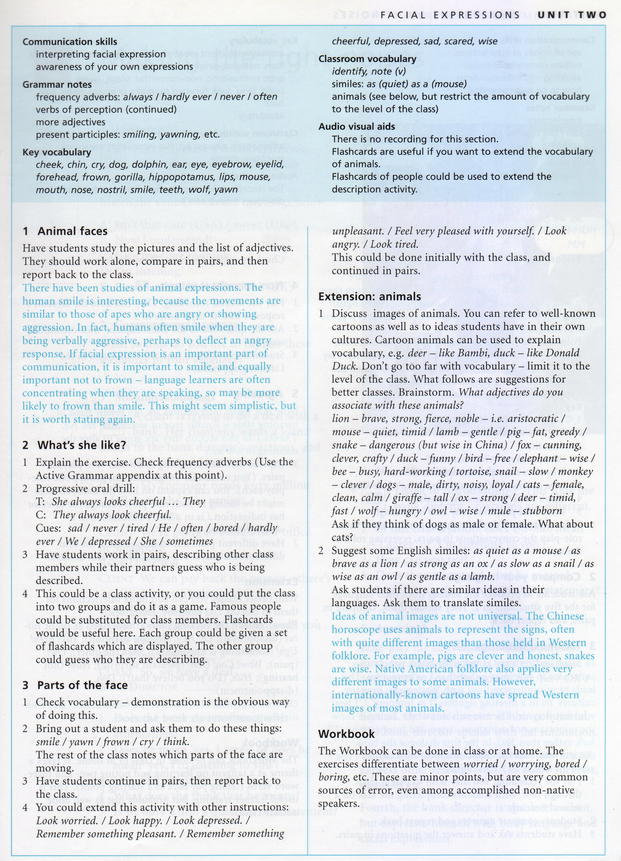 • Where materials include a great deal of cultural information, the teacher should be provided with notes in the teacher’s materials. In Handshake Teacher’s Book we gave the teacher cultural notes and additional facts or ideas in blue ink. When the teacher explains the information to the class, two important things happen. First the teacher has to explain in her or his own words, which exposes the class to less controlled comprehensible input. Secondly, the information comes from the teacher, not from the book.