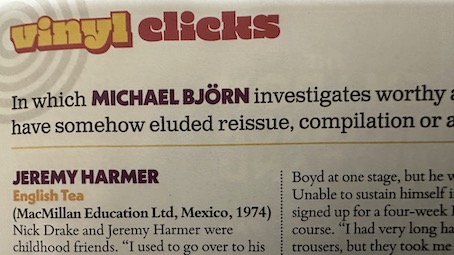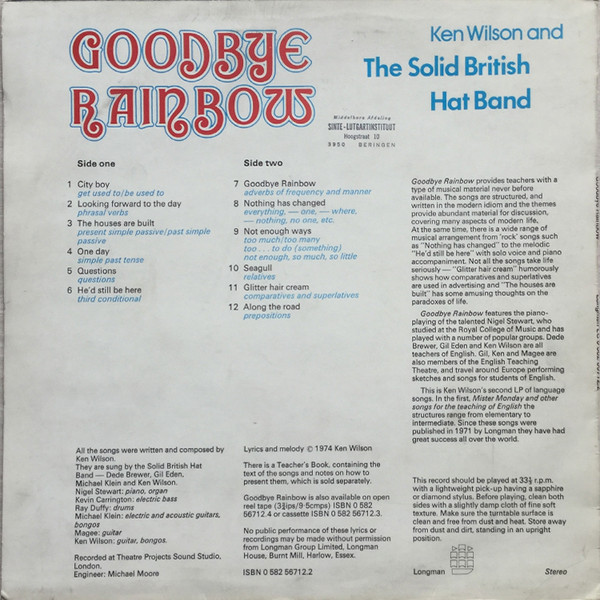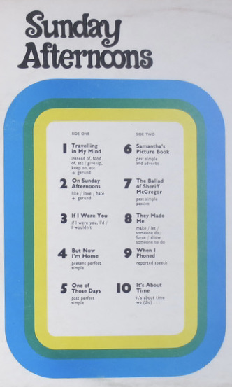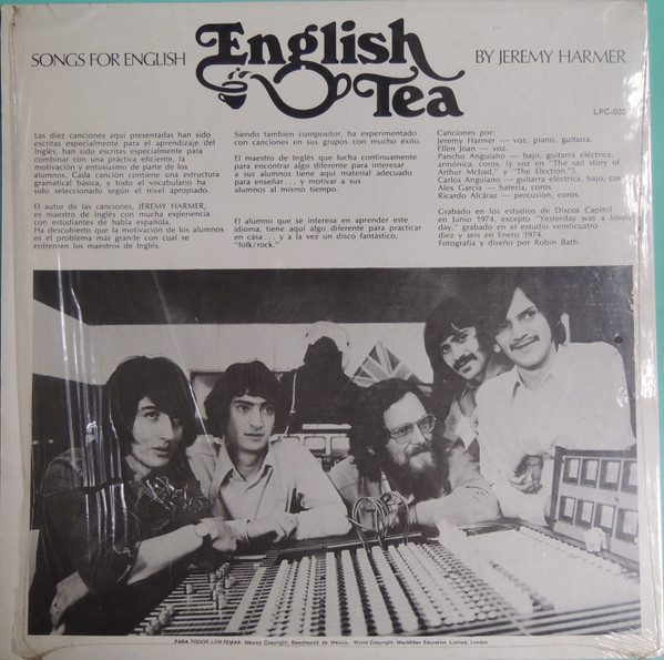 Our boss at Anglo-Continental (ACSE) came back from the Anglo-Mexican Institute in Mexico with a copy of Jeremy Harmer’s English Tea LP (Macmillan, 1974), with another set of teaching songs on it. I have the copy but somewhere along the way the sleeve disappeared. Inexplicably for English teaching songs, the titles are Spanish.