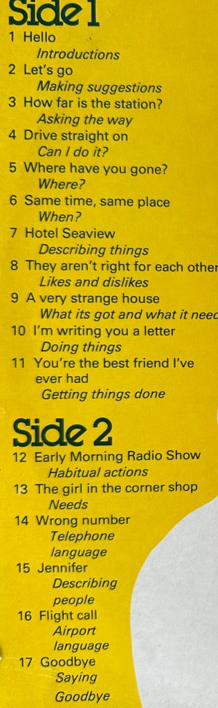 Towards the end of the 1970s songs were beginning to be incorporated in secondary and adult courses. They had always featured in primary materials. Strategies (Longman) had an accompanying set, Skyhigh in 1975, and Starting Strategies added Cloudsongs in 1977. Skyhigh was what we used for the songs session for lower intermediate. I have copies of both the ELT LPs from ACSE, but they have no sleeves. I remember they were copied onto a master tape and then discarded. I kept them, but the sleeves had gone.