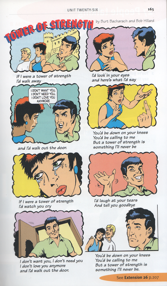 There were also songs which had some kind of extractable teaching point, such as Simon and Garfunkel’s El Condor Pasa (would, could), The Beatles’ Nowhere Man (indefinite pronouns), Andy Williams’ Can’t Get Used To Losing You (used to doing) and Elvis Presley’s Return to Sender (simple past – including gave, put, brought, wrote. ) The last is a text on irregular past tenses, that would seem to have crammed in too many examples of the structure if someone had written it especially for a text book. It’s been used several times. We used it in In English. You notice that I don’t quote the actual lyrics. Permission for doing so is (a) hard to get and (b) often expensive.