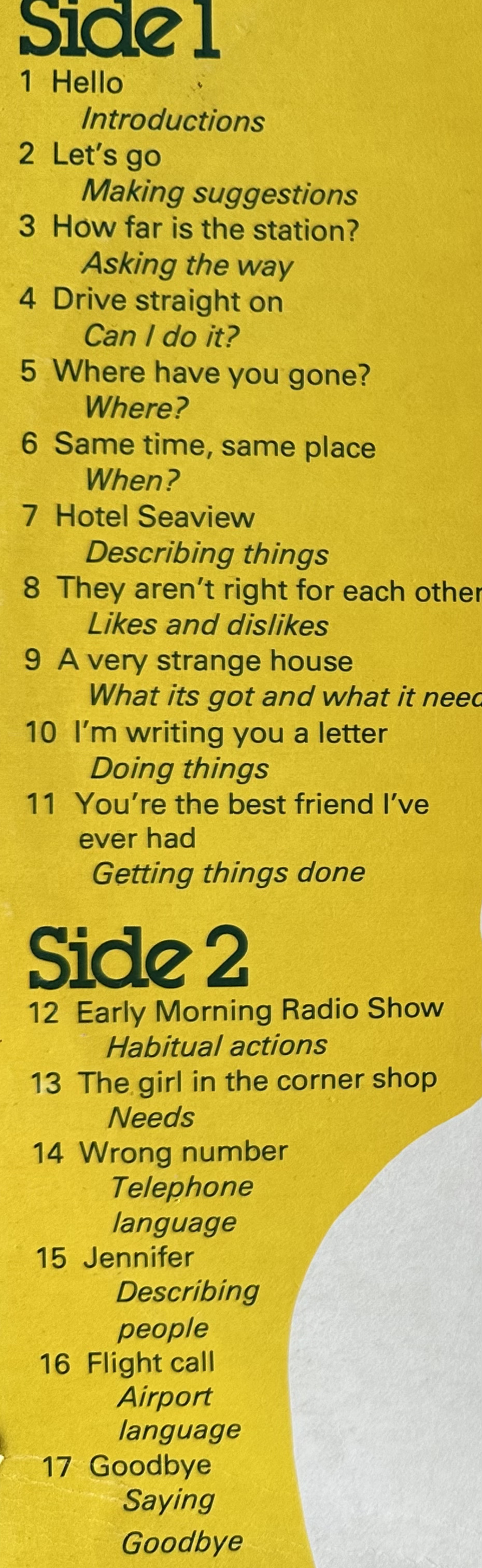 This set was written to accompany Longman’s Mainline Beginners A by L.G. Alexander. This book used functional categories rather than structural categories, but often this is a case of unit labels (Doing things instead of Present Continuous).