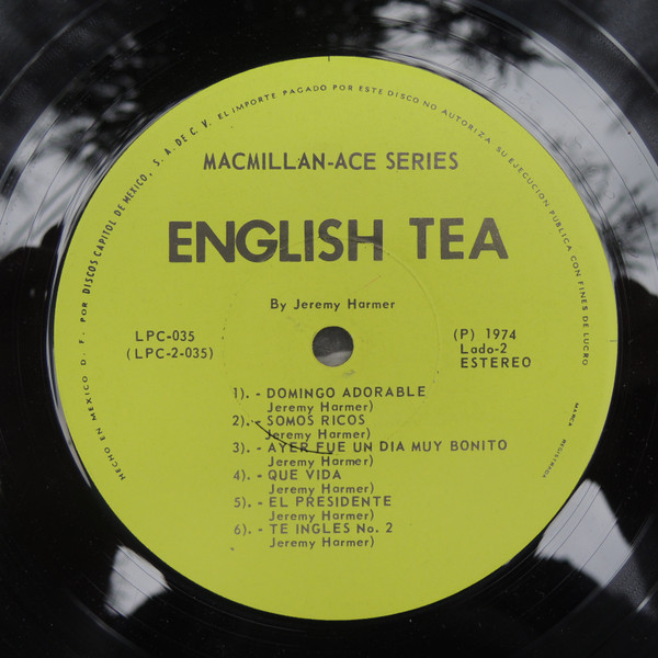 Our boss at Anglo-Continental (ACSE) came back from the Anglo-Mexican Institute in Mexico with a copy of Jeremy Harmer’s English Tea LP (Macmillan, 1974), with another set of teaching songs on it. I have the copy but somewhere along the way the sleeve disappeared. Inexplicably for English teaching songs, the titles are Spanish.