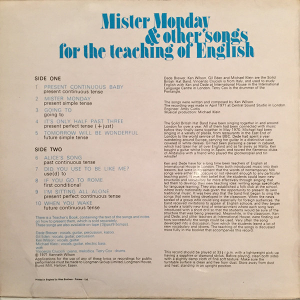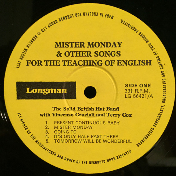 The first successful set of well-played, well-performed and teachable ELT songs was Ken Wilson’s Mr Monday (and other songs for the teaching of English) (Longman, 1971). These were professional studio recordings, and in 1971, Terry Cox of Pentangle played drums, which is as good as you could get.