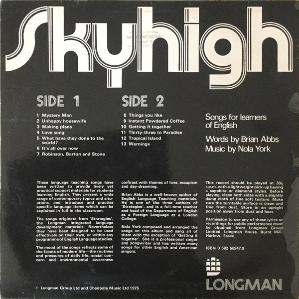 Towards the end of the 1970s songs were beginning to be incorporated in secondary and adult courses. They had always featured in primary materials. Strategies (Longman) had an accompanying set, Skyhigh in 1975, and Starting Strategies added Cloudsongs in 1977. Skyhigh was what we used for the songs session for lower intermediate. I have copies of both the ELT LPs from ACSE, but they have no sleeves. I remember they were copied onto a master tape and then discarded. I kept them, but the sleeves had gone.