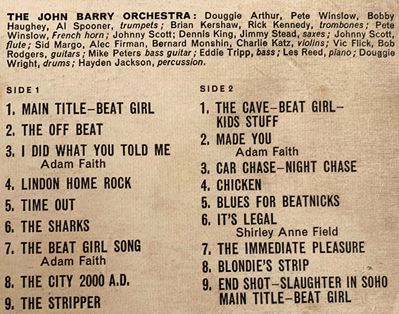 The film was one I’d wanted to see for a long time. My local record shop usually had a Beat Girl LP sleeve on the wall. It was the owner’s favourite sleeve, and he usually had another copy filed under soundtracks, and a third under Fifties / Sixties collectables. He confided that he could never resist buying in a copy when he saw one. I know the feeling. I have multiple copies of a few albums myself. As you can see, he sold me one.