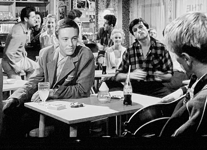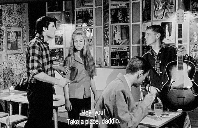Dave, glued to a guitar is Adam Faith. Tony (Peter McEnery) is posh and talks about his dad, the army general. Tony drinks alcohol, which Dave considers ultimately uncool. Then there’s Tony’s girlfriend, Dodo (Shirley Anne Field). For entertainment they watch Pinky Ross attempting to beat the world drumming record, but he falls asleep at 57 minutes 22 minutes. After a drum solo 57 hours long, all would be relieved.