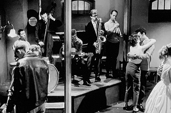 Once the newlyweds are safely tucked up, Jennifer gets out of bed (wearing a baby-doll nightie of course) and nips out to the Off-Beat Café to meet her beat pals.