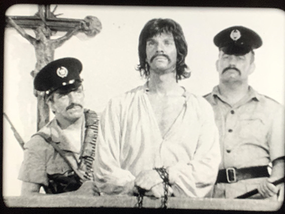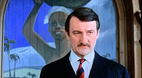 There’s a silent black and white film opening sequence … always annoying on our surround system which seems to need the amplifier waiting several seconds to leap into life. You wonder if it’s going to. “Once Upon a Time” says the title, and we see labourers picking coffee beans while armed overseers swagger about (It looks just like the recent stories about avocado farms in Kenya!). Malcolm McDowell with long moustaches takes a few beans. Title: “Coffee for the Breakfast Table.” He is seen by an overseer and arrested.