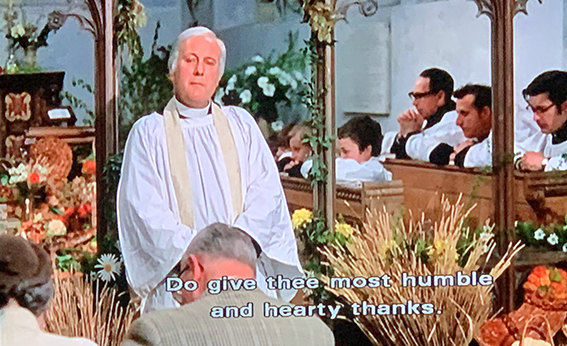 Travis has rescued his gold suit from his burning car. He finds his way to a church in open countryside, where a Harvest Festival service is in progress.