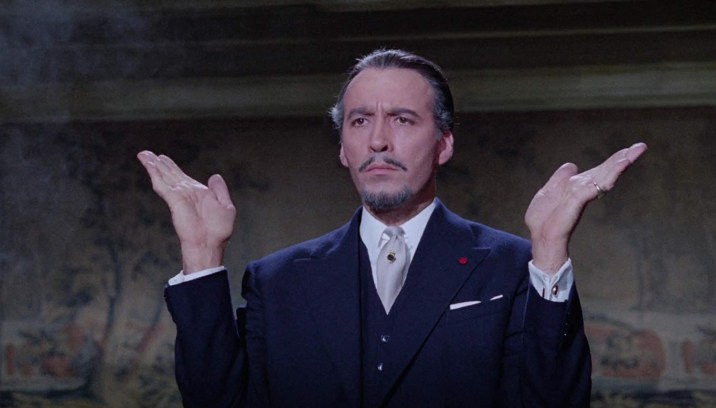 Meanwhile, back at the Duc’s, the sleeping Simon finds himself being strangled by the protective cross around his neck, the servant takes it off and he nips through the window to return to the Master … cult leader Monsanto … or rather Mocato (Charles Gray). It is easy to confuse two Satanic things.