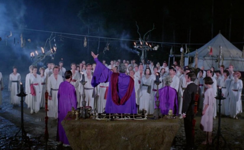 I noted contemporary reviews that felt that apart from the ever-magnificent Christopher Lee, the acting was somewhat “large.” Be fair, given the director’s note “You are a mad satanist with staring eyes in a purple nylon gown about to stab a young girl on an altar” you cannot expect the actor to think themself into a back story, or play it subtle.