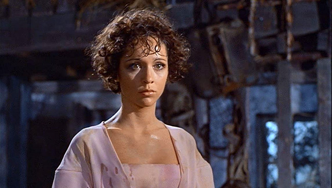 Tanith and Rex flee to a barn (she doesn’t really want to kill him), where he binds her hand and feet with leather straps, as you do, then stays to watch her carefully, whilst she’s writhing in the straw. Wispily clad victims writhing around were a Hammer Film trademark. OK. Leave that one. I will note that the posters show her as a victim in a thin petticoat. That doesn’t happen. Also some of the online stills of her writhing as a sacrifice are more explicitly underclad than in the film itself.