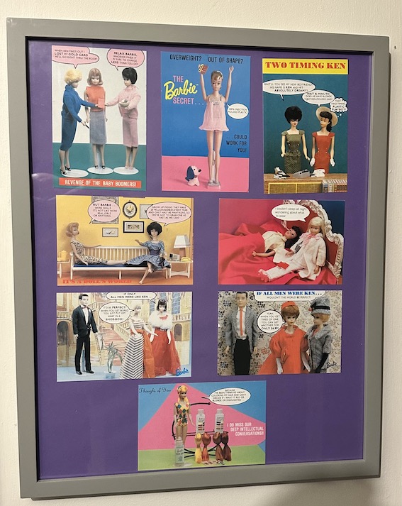 When we started going to the USA regularly around 1987, we already knew Barbie was funny. We picked up a selection of Barbie comic postcards that we mounted in a frame and still have today. The cards used posed dolls with speech bubbles. They were assertively (aggressively?) girlie, and generally had Ken put-downs. There was much less pink than people remember.