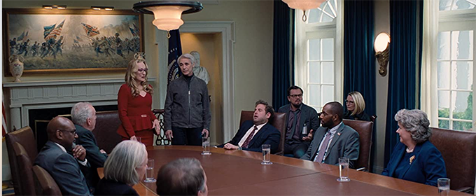 The reason they’re kept waiting for hours is the personal issues of the president, played by Meryl Streep as Donald Trump in a bright red frock, much better looking, but just as self-centred and focussed on votes and rabble-rousing. She is focussed on mid-term elections, and having trouble with her Supreme Court appointment of a right-wing Sheriff who turns out to be a porn star (and her lover). She’s not interested in the comet.