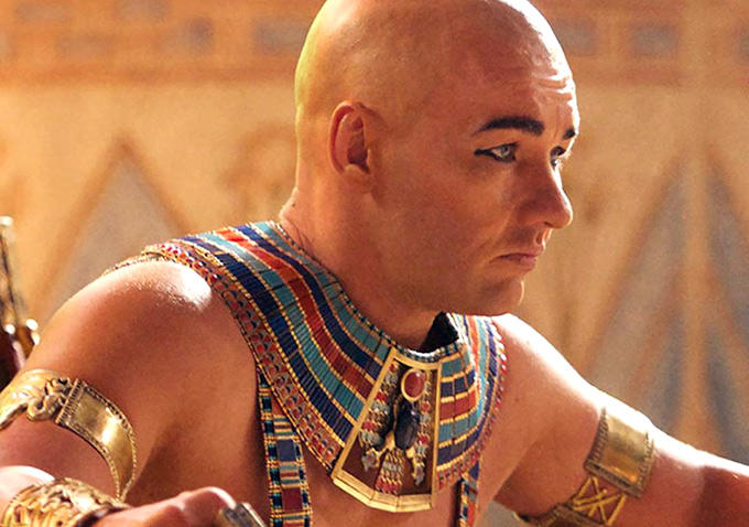 Then Moses gets exiled. He survives the assassins sent by Ramses’ mother (he kills them) and wanders about in the desert and crosses the Red Sea to Sinai, where he meets a tribe of goat herders and falls in love with Zipporah, not surprisingly as Maria Valverde’s absolutely gorgeous in the role. They marry. Nine years pass. They have a son. But Moses wants to explore the forbidden mountain. God’s mountain. Up he goes. Terrible storm. Encased in an avalanche of mud. Looks up, sees a burning bush … stop me if you’ve heard this before. There he meets God in the form of a nine year old boy. He’s sent off to rescue his people. Fortunately, the filmmakers decided to skip the bit in the bible at this point where Zipporah has to circumcise their son with a sharp stone. Back to Memphis, he seeks out Nun, who did not leave a number, but he knew the place to call. Nun inscribed a Hebrew character, and he found it on the wall. Without the Egyptians noticing, the Hebrews manage to do extensive horse and archery training to prepare to revolt. In Memphis in the meantime, Ramses is devoted to his baby son.