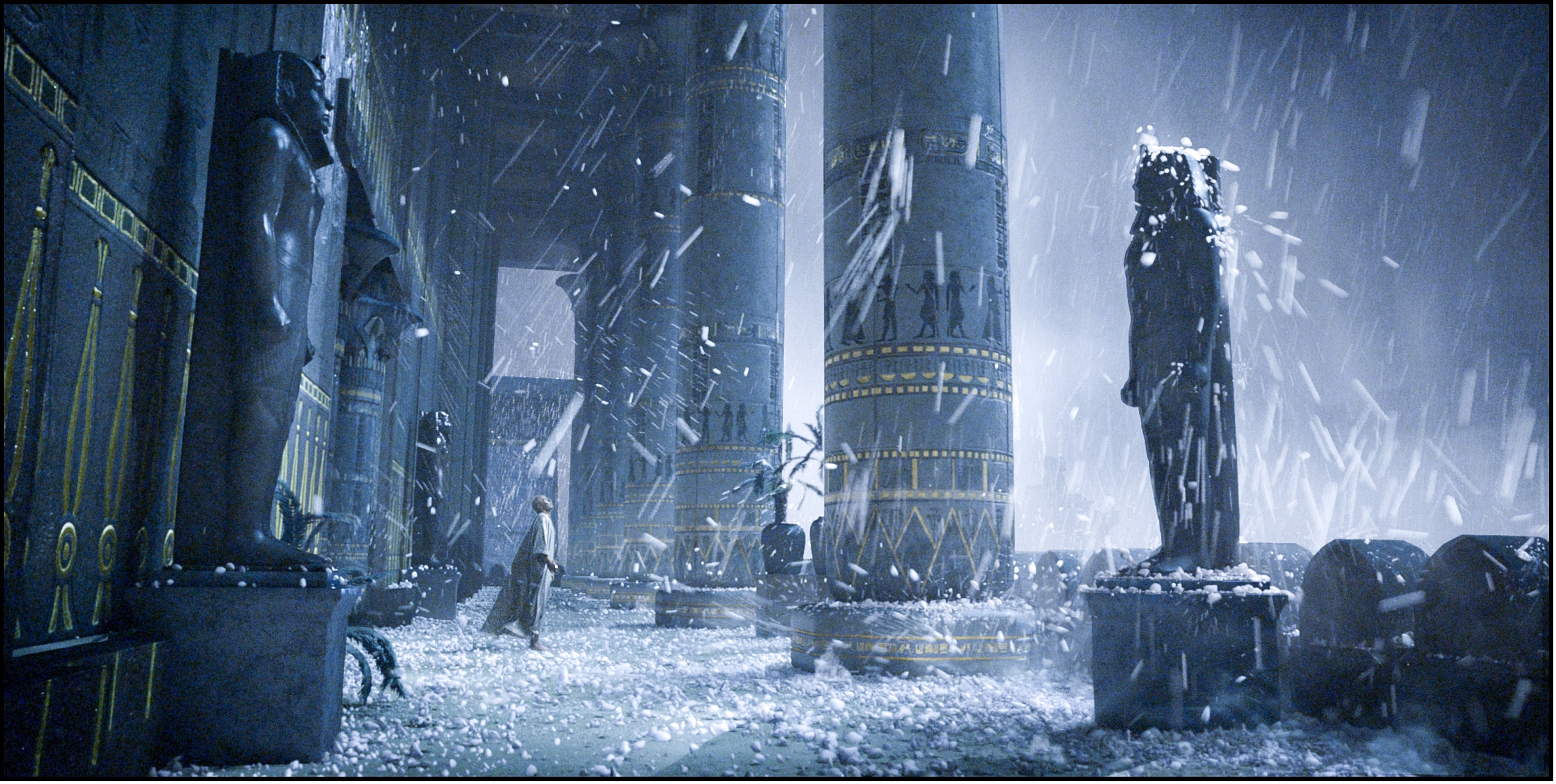 The plague of hailstones: Ramses watches, ‘Stay indoors! It’s pissing down out here.’