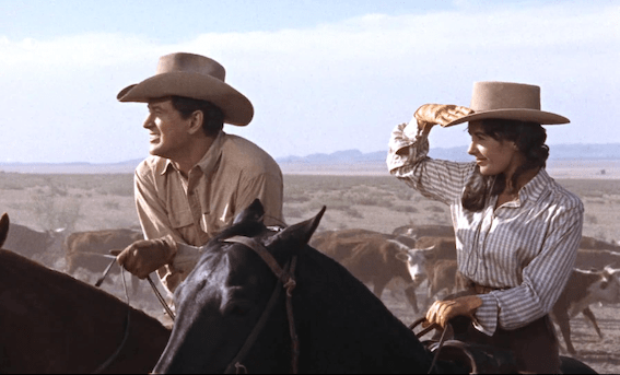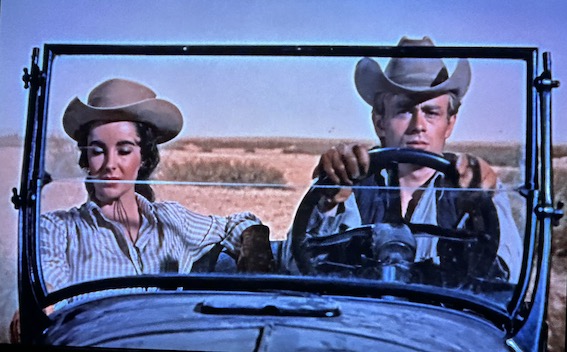 In a nod to her beginning in National Velvet Elizabeth Taylor plays Leslie, a horse-mad young girl in verdant Maryland, engaged to a British diplomat. Jordan ‘Bink’ Benedict arrives to buy her horse, War Winds, as breeding stock. He ownes a half million acre cattle ranch in Texas. They instantly fall in love after a little requisite argument, and we next meet her on their honeymoon train to Texas. She asks when they’ll reach Texas, and discovers they’ve been crossing it for eight hours already.