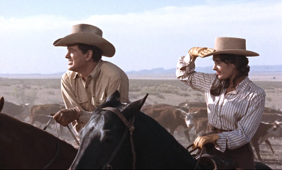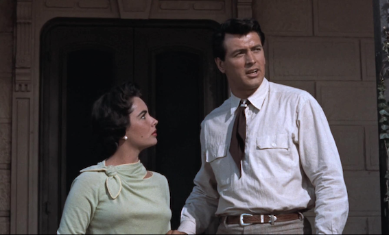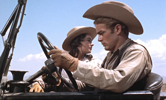 In a nod to her beginning in National Velvet Elizabeth Taylor plays Leslie, a horse-mad young girl in verdant Maryland, engaged to a British diplomat. Jordan ‘Bink’ Benedict arrives to buy her horse, War Winds, as breeding stock. He ownes a half million acre cattle ranch in Texas. They instantly fall in love after a little requisite argument, and we next meet her on their honeymoon train to Texas. She asks when they’ll reach Texas, and discovers they’ve been crossing it for eight hours already.