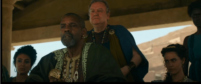 The gladiator master is Macrinus, an historical figure. Reviews point out that the real one was Berber, not sub-Saharan African (a polite way of saying lightly suntanned rather than black). Let’s be clear. This is Denzel Washington. He is a great actor. That is why Macrinus is ‘sub-Saharan’ in appearance. Also, Jugurtha, the Numidian leader, is sub-Saharan ethnicity. The other Numidians look North African, not sub-Saharan. But then that part was filmed in Morocco. So to the gladiator school? It’s tough, but I expect you knew it would be. Haddo gets knocked about by Viggo, the trainer.