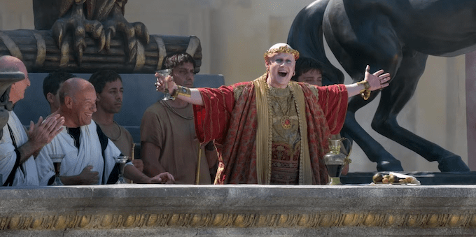 At the Colosseum, Matt Lucas is Master of Ceremonies. The “twin” Emperors are two twisted sadistic perves, Caracalla and Geta. Apparently they were conceived as Beavis and Butthead in togas, with a touch of Johnny Rotten and Sid Vicious. Whatever, they are brilliantly nasty. At one point Geta appoints his beloved pet monkey as a consul (echoing Caligula and his horse). Caracalla points out that Geta has had the disease of his loins spread to his brain. OK, that would be syphilis, but that didn’t appear in Europe until 1495.