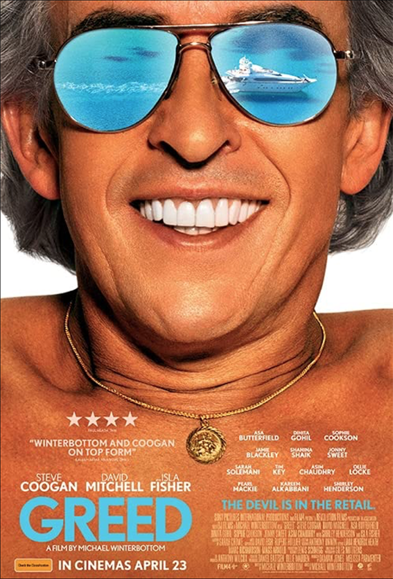 To me, it’s closer to a comedy biopic with Steve Coogan as Sir Richard ‘Greedy’ McCreadie. The foul-mouthed Estauary voiced billionaire was educated at public school before leaving at sixteen to graduate from doing the three card trick ‘Find the Lady’ to running a retail empire. SIR RICHARD … ah, Sir Richard Branson too? Richard + Green? Richard Green was the actor who played Robin Hood on British TV … I’ll stop there.