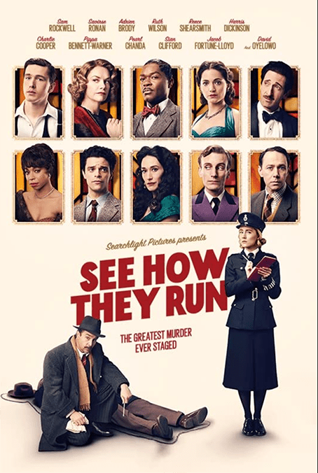 See How They Run is a different take altogether, and easily bests both the above as entertainment. It’s based around The Mousetrap, the Agatha Christie play now in its 70th year of continuous running in London. It opened in November 1952. The Mousetrap was originally called Three Blind Mice but Christie had to change the title because there was another play called that. This film takes the next line of the song (which appears in the play). The cast is now changed annually- previously some actors passed a decade in their roles. David Raven played Major Metcalf 4575 times. Ten million tickets have been sold in London and around five hundred actors have been in the cast. The play opened at The Ambassador Theatre in London, then in 1974 moved next door to the St Martin’s Theatre without breaking its run. The film was partially made in the latter. The play ends with the audience being asked never to reveal the ending … who done it. This film ends with the same exhortation, and I’ll follow it and avoid plot spoilers.