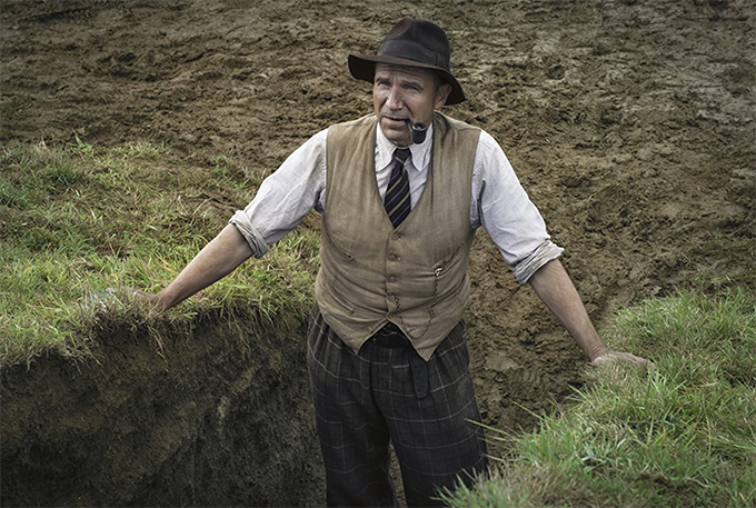 It’s from the facts, based on Mrs Edith Pretty (Carey Mulligan) who wanted to investigate the ancient mounds on her land, and who employed a highly-experienced “excavator” Basil Brown (Ralph Fiennes) instead of an archaeologist. Basil left school at twelve, but is a Sussex accented countryman as a quiet polymath. While the authorities on archaeology assume it’s a Viking burial, Basil is the voice predicting accurately that it will be Anglo-Saxon. I’ve seen Ralph Fiennes in many roles, none anything like this one, and he is completely “real” in the role.