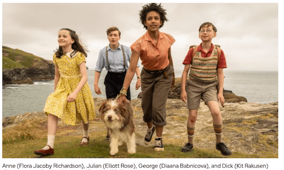 Authenticity? The dialogue needs work. George, as in the first, still says ‘Whatever.’ Julian says, ‘Just stop, already!‘ I know in the original books his friends call him Ju, but that doesn’t mean he should launch into New York Jewish-American dialogue. Then Anne declares, ‘If you don’t help me find her, I’ll scream!’ There they’ve drifted into Just William books by Richmal Crompton and Violet Elizabeth Bott, ‘I’ll thcream and thcream until I’m thick! I can, you know!’ It’s a shame because the TV Anne is much less “wet” than the Anne in books. Julian though has had his snotty head prefect personality eradicated which loses a lot of humour. As above, Dick is much brighter. George retains centrality. I find an Aunt Fanny who doesn;t produce vast feasts constantly disappointing.