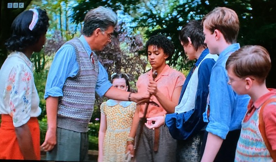 The other three look, surprisingly, near perfect for the era and costume … Anne, Dick and Julian. They rightly lose Julian’s shortened name in the books, Ju. Dick … yes, Blyton has a book with a Dick and a Fanny … differs. In this he’s an erudite boy genius. In the books Dick is thick, and is rarely seen without a torch and penknife. Here he looks remarkably like Harry Potter. Julian, who looks like a young Oliver Chris playing Prince William, has much less to say here.