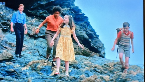 We start out with a ‘Timmy origin issue’ as we see George sailing alone to the rocky granite Kirrin island set off the chalky Dorset cliffs. She finds Timmy the dog there (his name is on his collar) and on return finds a dead deep sea diver on the beach. When the cousins arrive they go to look at the dead diver and poke the body with a branch. Um, Enid wouldn’t have had kids do that. We hear no more of him. Or her. You can’t tell with a copper helmet. I find the camera shots with the horizon at a diagonal very silly. This is not an art film. Keep the horizon straight. Possibly go and watch The Fablemans and digest John Ford’s advice on horizons.