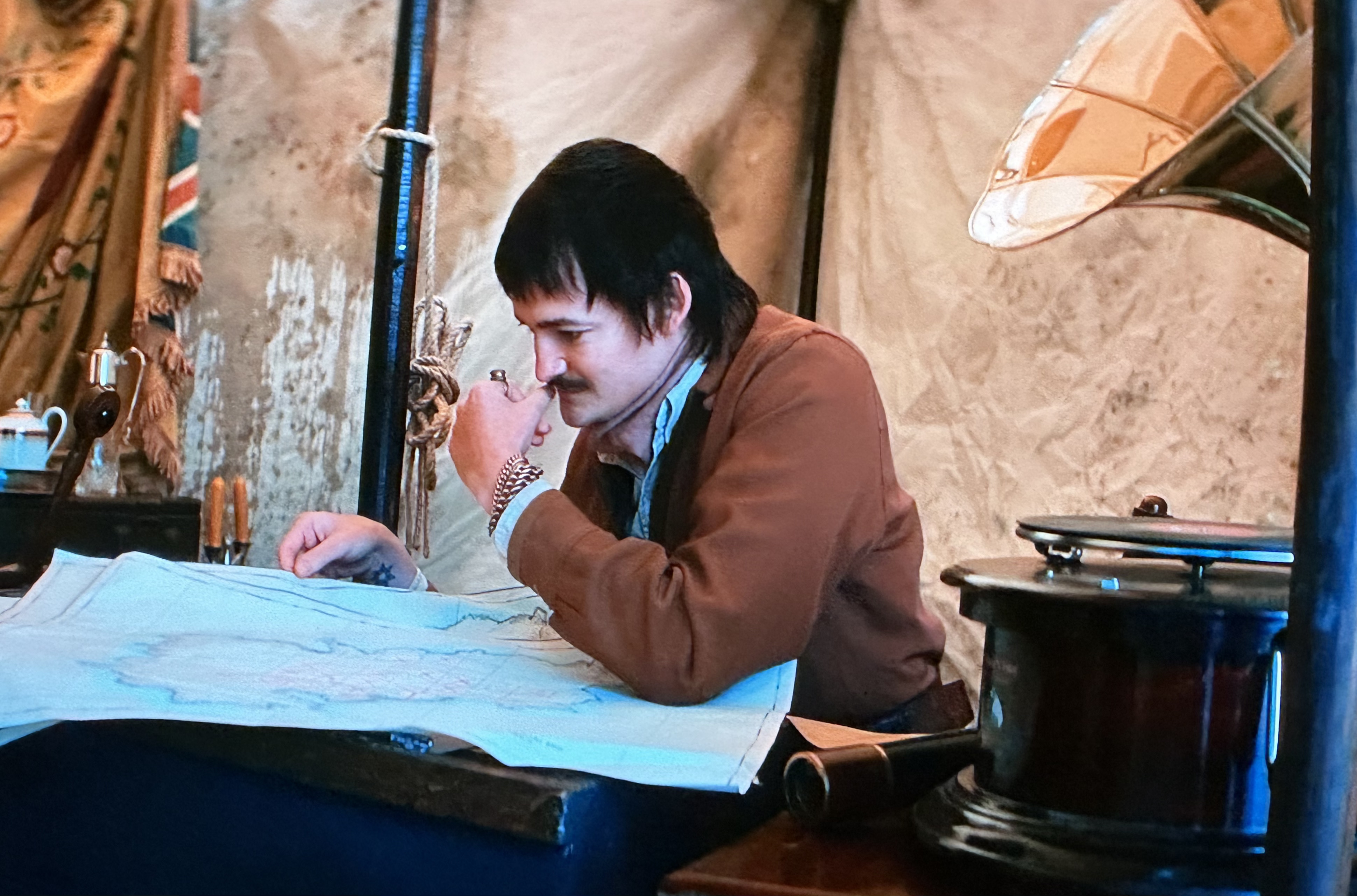 The secret room fills with water and the walls start moving … oh, no. This is Star Wars or Indiana Jones. Or both. Fortunately, they hear a tube train and Julian susses at once that it’s the District and Circle line, and they climb through (sigh) a tunnel and head off to Belsize Park. I think this when we finally hear that it’s 1939. They realize the Templar church is in Syria. That’s a red herring. They go to the massive mansion with extensive parkland grounds which is in … allegedly Twickenham? What? Tommy is going off on one. At this point I realize where it’s all going and switch on my phone and subtitles on the TV. Let us contemplate Tommy’s speech: