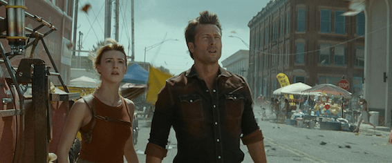 Still we were watching Twisters not Wolverine, The first fifteen minutes sets the story. Kate is a student meteorologist and is on a project with her university student friends, Praveen, Addy, Javi and her boyfriend and partner, Jeb. They are testing Kate’s idea that releasing a load of chemicals (sodium polyacrylate, so IMDB tells me) into a tornado will break it up. It fails disastrously. The silver foil test balls with the chemicals fly 70,000 feet up. Twice the height of a plane. Really? Are tornados that tall? Well, it was a big one. Kate is traumatised by the disaster.