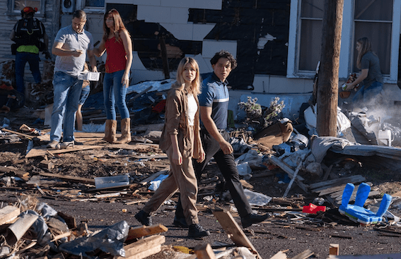 The screen switches to FIVE YEARS LATER. Kate is working in New York. Javi, a survivor of the earlier disaster (he was in the follow up truck) turns up. He has a new job researching tornados in Oklahoma, can Kate help for a week? Javi’s smartly uniformed team are called ‘Storm Par’ and have gleaming white trucks, and have major financial backing, and all of them have doctorates. However Kate has a knack of watching the amber waves of grain (that’d be a good song title) in the fields and knowing where storms will go.