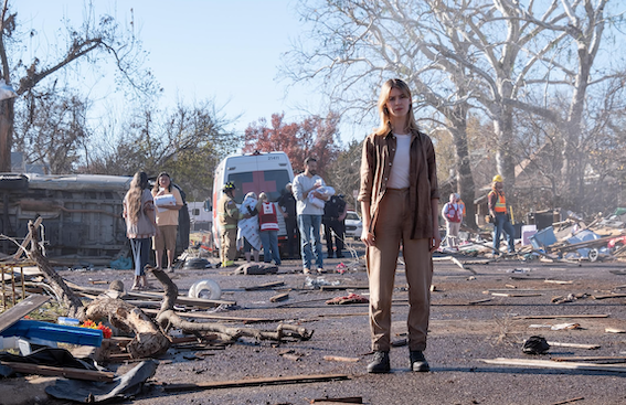 The screen switches to FIVE YEARS LATER. Kate is working in New York. Javi, a survivor of the earlier disaster (he was in the follow up truck) turns up. He has a new job researching tornados in Oklahoma, can Kate help for a week? Javi’s smartly uniformed team are called ‘Storm Par’ and have gleaming white trucks, and have major financial backing, and all of them have doctorates. However Kate has a knack of watching the amber waves of grain (that’d be a good song title) in the fields and knowing where storms will go.