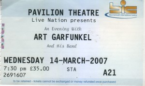 Art Garfunkel doesn’t rock, as his onetime partner has said, but his voice is so sublime, it has healing qualities. We had dead centre front row seats for the show last night at Bournemouth Pavilion. Bizarrely, we had received a letter from the venue that morning (everyone did) reminding us that we MUST be seated before 7.30. Everyone was, and sat in silence for twenty minutes until it started, enlivened only by announcements that anyone wishing to go to the toilet must only do between songs. There were notices on the door saying “Loves, please do not open this door during the concert. It affects my concentration, Art.”