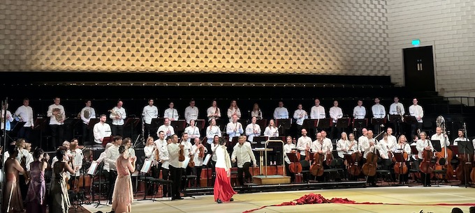 The orchestra was compressed by having a wide front stage area added for the ballet in Rite of Spring. The timpani were squeezed in behind the violins, and the rest of the percussion was literally ’round the corner’ extreme stage left. In the first part the orchestra players were dressed in black with black shirts. There was dance only in The Rite.