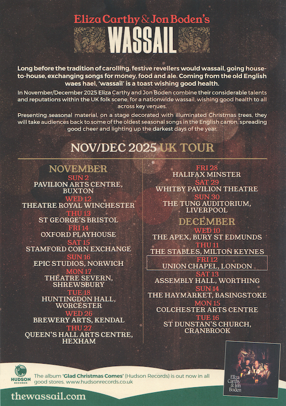 I list the tour below. It’s a fabulous evening’s entertainment, great singing and music. It will be coming reasonably near most readers. If it’s not, buy the CD or LP.