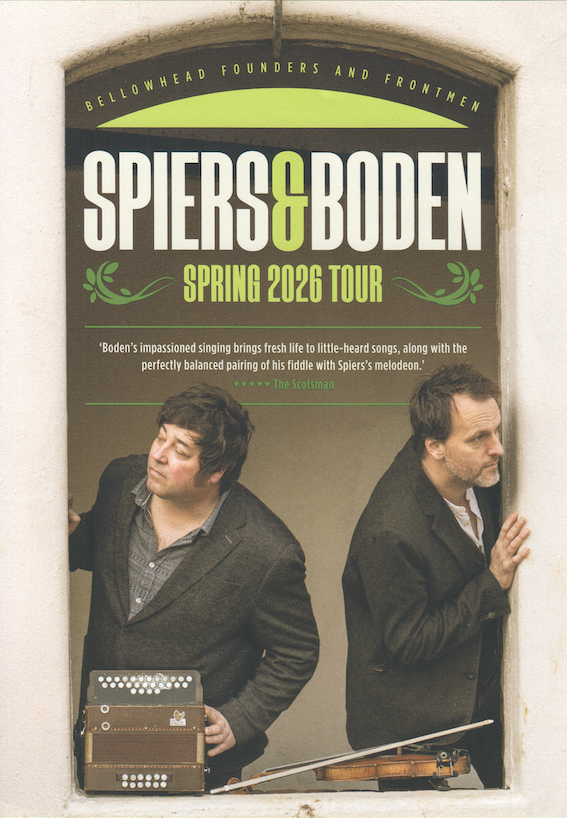 We thought we’d seen them as a pair quite recently, but in fact it was a dozen years ago, though we saw Jon Boden with Eliza Carthy just before Christmas. The Spiers & Boden tour started in early February, but you could still catch it at Caerleon, Falmouth, Topsham, Narberth and Aberystwyth.