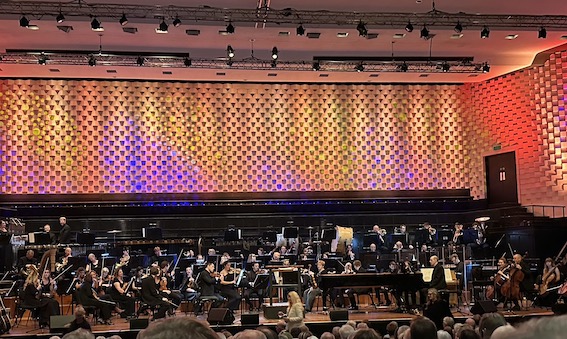 There is added interest in the way the composers later commented on who did what. Paul McCartney has been particularly vehement, and caused a fuss by wanting to reverse to McCartney-Lennon on a reissue of Yesterday, which was occasioned by John's disparaging remark in How Do You Sleep? You live with straights who tell you, you was king Jump when your momma tell you anything The only thing you done was yesterday And since you're gone you're just another day It never stopped John taking half the royalties on Yesterday. John also took a swipe at Another Day and Linda McCartney. I understand Paul's point of view having done a series of textbooks as 'Hartley-Viney' (like Paul, I am alphabetically challenged on credits). I've also been quite vehement on who actually wrote what. The one that gets me is the second in the Streamline series. Our publisher, OUP, decided to split our original one book into two, and asked for four new units at the start of book two to bridge the (new) gap. There was a deadline. I co-wrote them with Karen … 100% … while my co-author was in Latin America. He refused to even acknowledge Karen's contribution in the introduction, though one later unit was entirely her work. Before we start. I took my seat at 7.15 and most of the string sections are on stage tuning up. Woodwind come on 7 or 8 minutes later, and brass a couple of minutes before the start. I suppose brass don't need to tune up. Unlike the BSO Pink Floyd concerts, there is no bass guitar and the standard drummer, hidden behind the pianist, doesn't play much. There are timpani, tom toms, bongoes and a BIG bass drum.