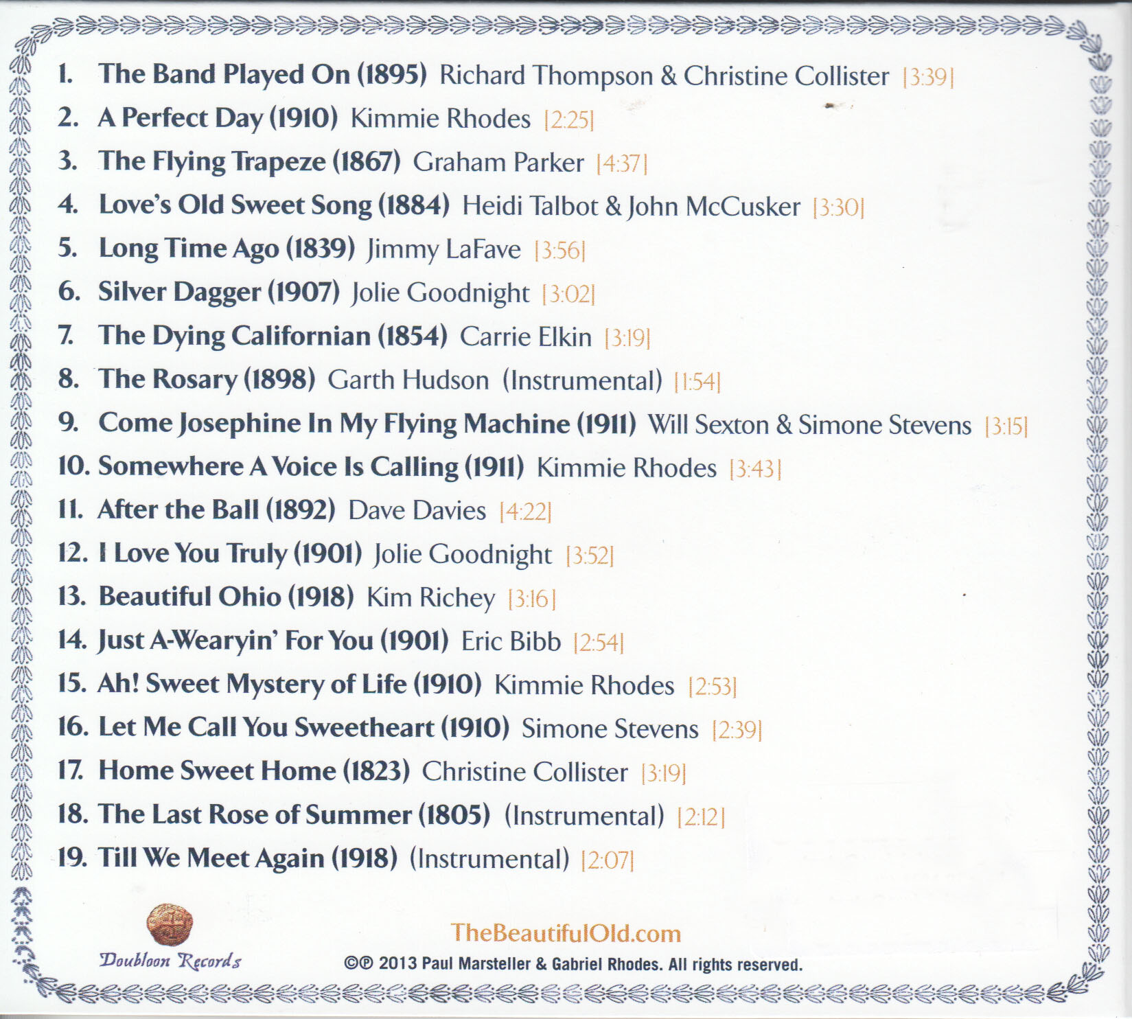 The Beautiful Old is a compilation of popular songs most of which are at least one hundred years old. Some date from the 19th century, the others are very early 20th century. The oldest, The Last Rose of Summer, dates back to 1805. The youngest, Beautiful Ohio and Till We Meet Again, date from 1918. With this sort of material, we are looking at songs with major sheet music sales consistently over decades, so pinpointing a particular year, as we might do with songs since charts started, is irrelevant.