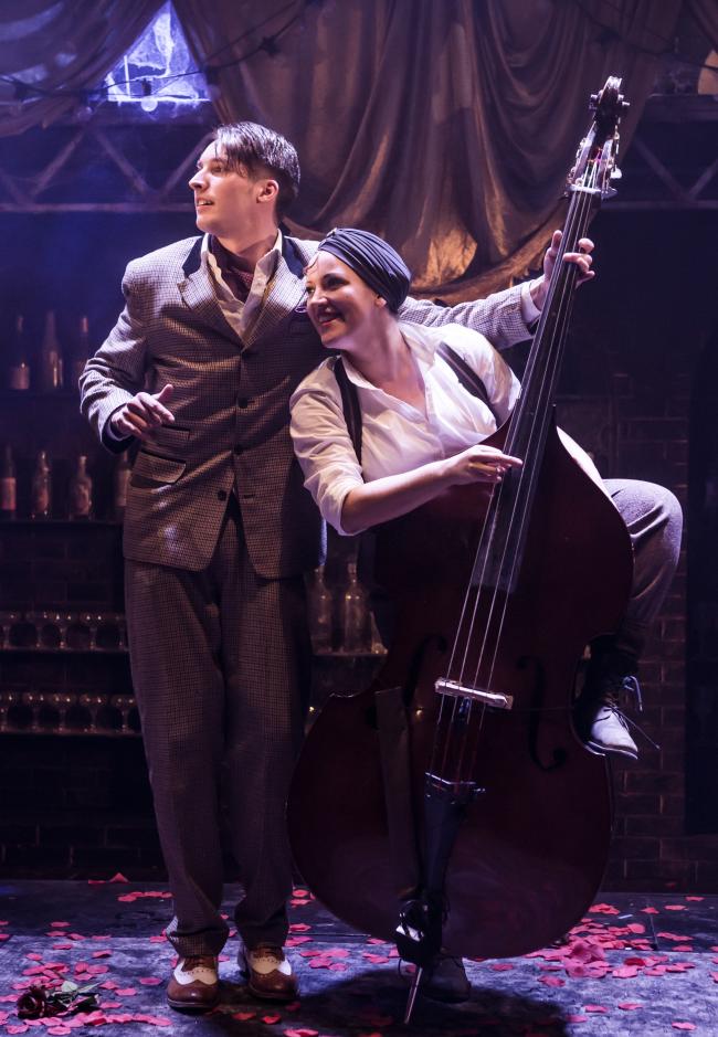 The outstanding role was Lauryn Redding as Sir Toby Belch. Forget whether she was male or female: she played it as the Ringmaster. The Master of Ceremonies. The link. This is a part that so often falls into dull “stage drunk” with dreadful lines, yet it was the choice role of the theatrical stars of the 1940s and 1950s. Lauryn Redding recaptures that with a relaxed take, heavy on audience interaction. Usually Sir Toby’s lines fall flat next to Sir Andrew Aguecheek, but here they both worked. Both Sir Andrew (Mike Slader) and Orsino (Jamie Satterthwaite) are tall and thin, which was visually interesting. A very funny Sir Andrew. And she plays double bass.