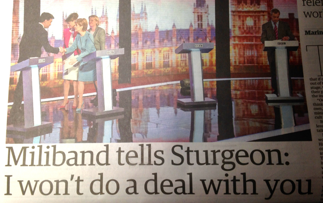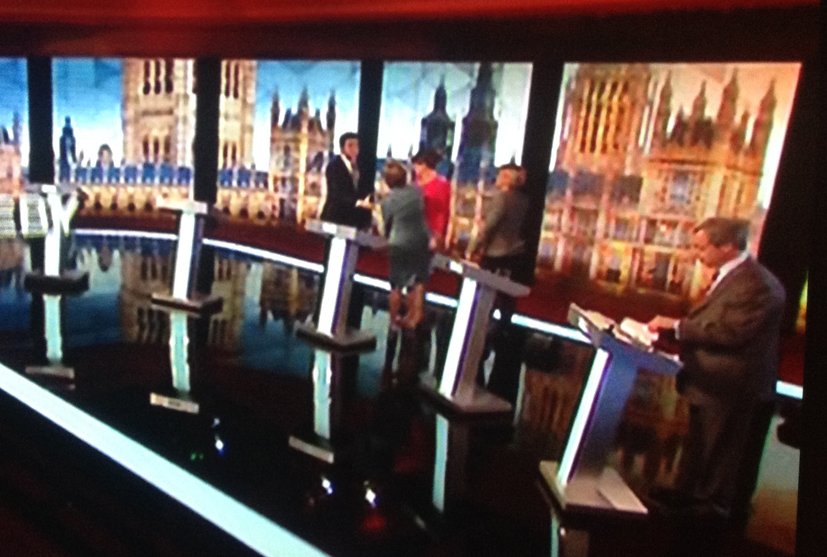A telling picture. Four of the five shaking hands at the end of the debate. Farage alone. After this screenshot (with an iPad) I missed the last one. Wood and Bennett turned on their heels and walked out. Petty. Sturgeon and Miliband both had the grace to walk over and shake hands with Farage. I think that’s what you do. He might be to their right, but the man isn’t Le Pen. Sturgeon and Miliband are, I think, still the only two who will have any say over the next government.