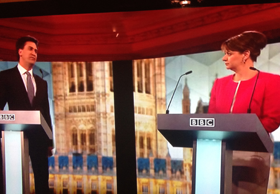 Fascinating. In the seven-way debate all four men followed the perceived rule: dark suits, light shirts, ties. This time we have two men. Miliband followed the rule. Very dark suit, white shirt, silver tie. The tie might be an error, as it makes him look like an usher at a wedding. Or possibly Frankie Vaughan on stage.