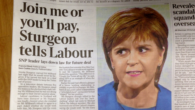 Sturgeon is a bully, and tried to bully Miliband over an anti-Tory coalition. We all know they’ll speak and deal behind closed doors … that’s the anti-democratic trouble with coalitions … but she wanted him licking her hand on air. Point scoring. It also enrages Labour who point out that she’s been vehemently against them as long as they can remember. I’m not sure she isn’t overplaying her hand. I spoke with an ex-union rep friend who said his first choice was majority Labour. Second choice, majority Conservative. Nightmare scenario for English and Welsh voters: An unelected Nicola Sturgeon telling a minority Labour government what to do.