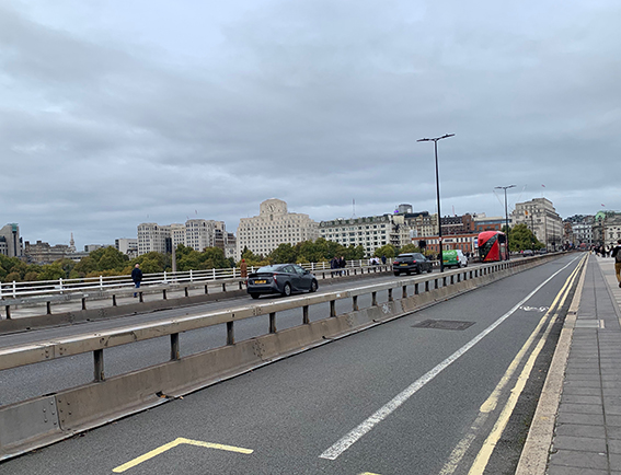 Waterloo Bridge. 11.30 a.m, Friday morning. Dual carriageway bike lanes either side. The hyped-up lycra clad sports cyclists need dual carriageway bike lanes so they can ride past any normal people who are using bikes merely as a means of transport. In walking across slowly, we saw only two bikes. And one was in the main roadway holding up the buses (with a delivery pannier), not in the luxury cycle lanes.