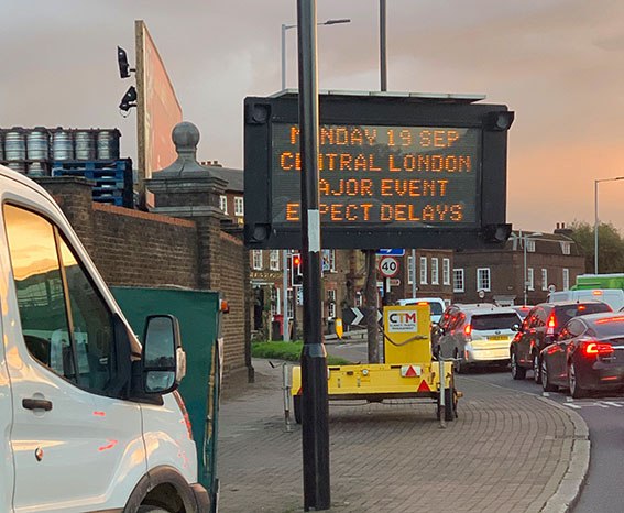 What’s wrong with this picture? It was taken by Karen from the passenger seat on Saturday 15th October 2022 at the Chiswick roundabout junction. The event on Monday 19 September was the Queen’s funeral (and in the other direction, going in, not going out). So it was virtually a month out of date, but Transport for London still had it powered up. Advertising is banned on UK motorways because it distracts drivers. Yet these lighted signs are used for out of date messages, and inane messages. A warning sign should only be used for warning or it becomes ineffective.